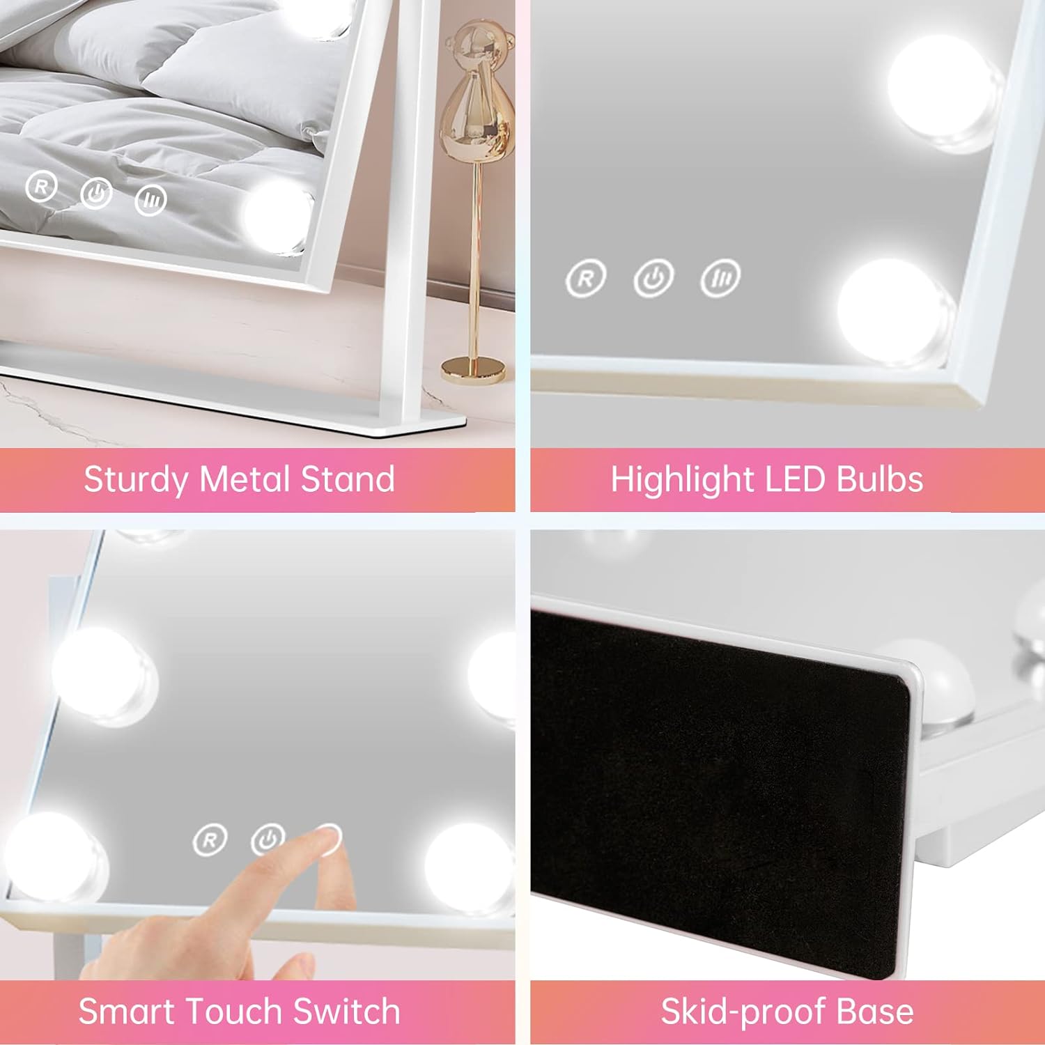 - 【HD Lighted Hollywood Mirror】The vanity mirror with lights is equipped with 9 bright LED bulbs, the bright lightness allow you to see clearly your face and make a flawless makeup . Stylish modern Hollywood style lighted vanity mirror perfect for home dressing desk.