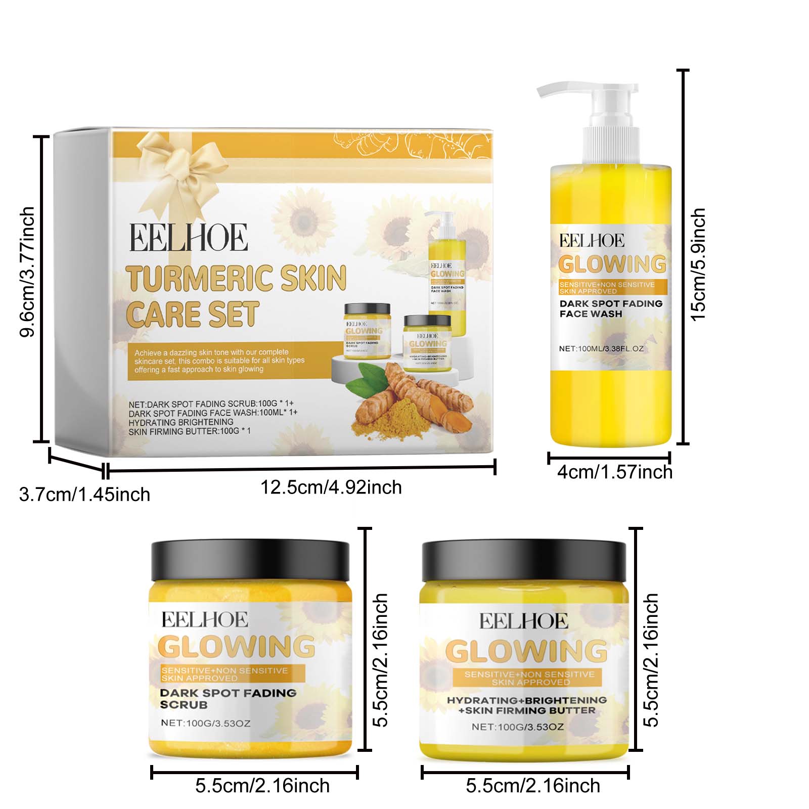 Our Turmeric Skin Care Set contains Curcuma Longa(Turmeric) Root Extract, Persea Gratissima(Avocado) Oil, Simmondsia Chinensis(Jojoba) Seed Oil. It can effectively remove impurities, deeply clean the skin, shrink pores, make the skin more delicate and smooth, create a delicate and refreshing appearance, reduce wrinkles and fine lines, improve skin elasticity, make the skin firmer, effectively moisturize the skin, provide long-term moisture supply, and keep the skin soft and smooth. How to use it is very simple: Cleanser usage: Apply an appropriate amount of cleanser to wet skin, gently massage, and then rinse. Scrub usage: Apply appropriate amount of scrub to wet skin, gently massage in circular motion, leave for 10 minutes, and then rinse with water. Face cream Usage: Clean the face, evenly apply the face cream on the face skin, gently massage until completely absorbed. It can gently clean the dirt on the skin surface, moisturize the skin, and adjust the water and oil balance of the skin.